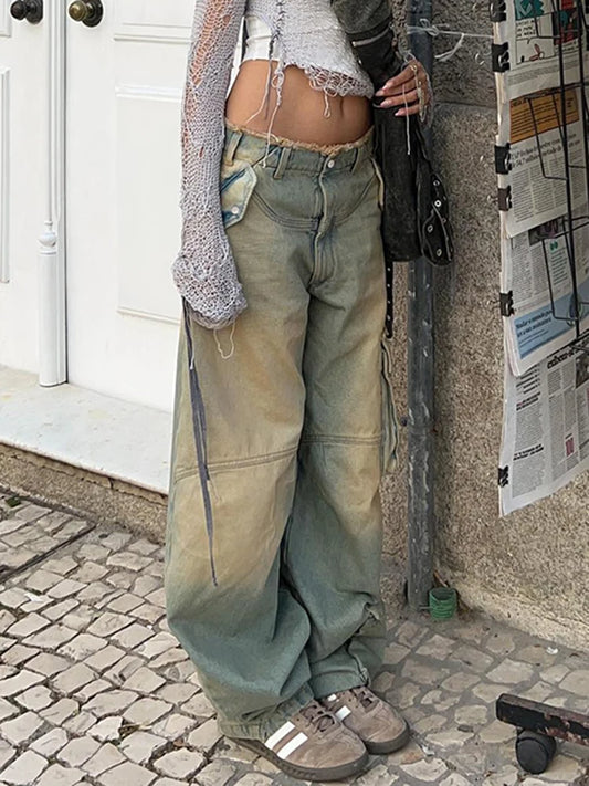 ALLNeon Vintage Tie Dye High Waist Jeans: Y2K Aesthetics Brown Denim Trousers