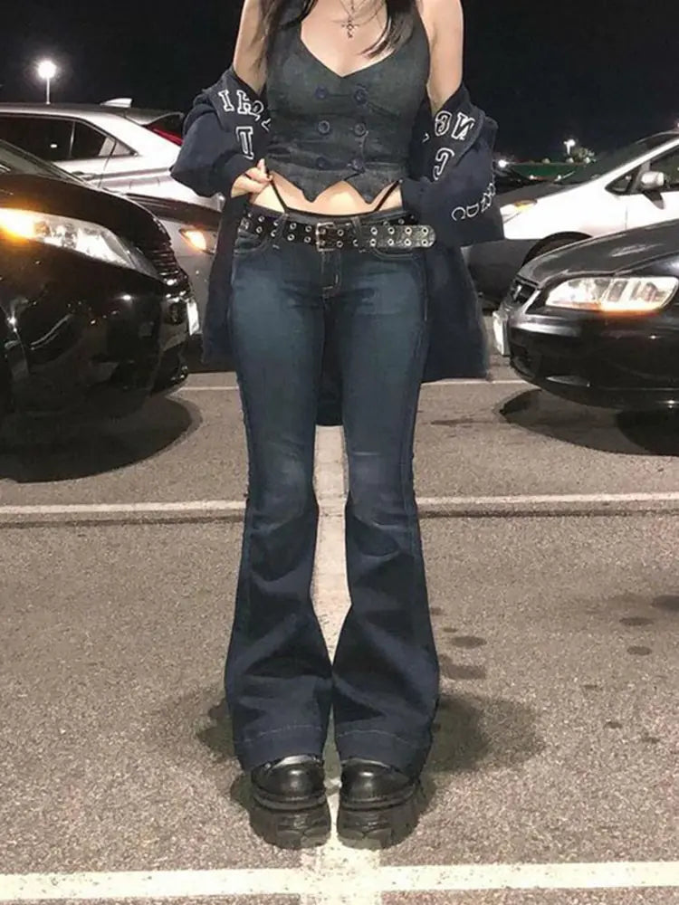 Elevate your streetwear game with our Kalevest Y2K High Street Low Rise Jeans. These blue women's pants boast a bootcut design and wide leg silhouette, offering a blend of trendy style and Y2K nostalgia.