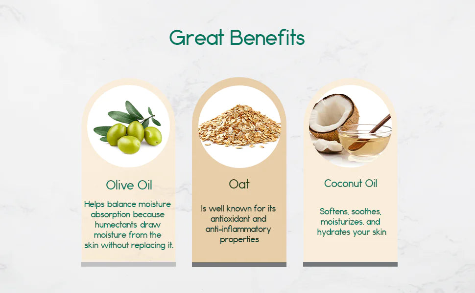 -VORTEILE. Hafer ist für seine antioxidativen und entzündungshemmenden Eigenschaften bekannt. Inhaltsstoffe wie Kokosnuss- und Olivenöl machen Ihre Haut weich, befeuchten und hydratisieren sie. Es hilft, die Haut feucht, aber nicht fettig zu halten, was zur Regulierung der Feuchtigkeitsaufnahme beiträgt, da Feuchthaltemittel der Haut Feuchtigkeit entziehen, ohne sie zu ersetzen. Honig ist für seine antioxidativen und entzündungshemmenden Eigenschaften bekannt.