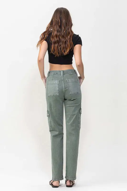 High rise straight with cargo pocket detail - comfort stretch denim, high rise, straight jean, cargo patch pocket detail, reg length F. Rise: 10” / inseam: 29” / leg opening: 16” 98.5% cotton 1.5% spandex. Model is 5,9” wearing size 26.